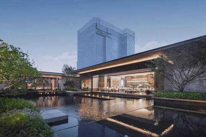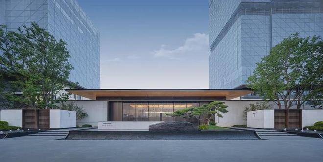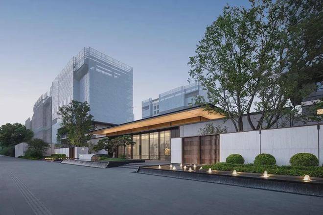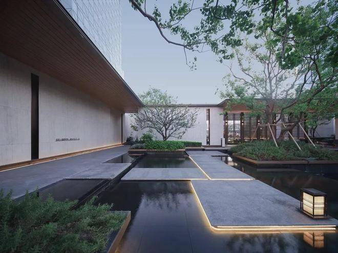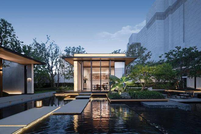 建筑门堂的比例恰到好处,呈现出诗意画境。1:5至1:6的高宽比,使建筑既稳重又灵动。入口两侧的景墙与水景相映成趣,勾勒出一条充满诗意的归家之路,体现了江南昆山的东方韵味。