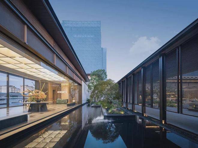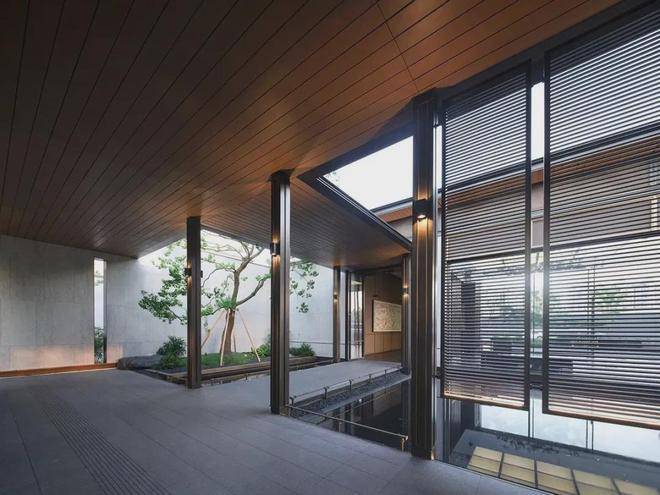 穿过门堂,便是宽阔的琉璃光院。长20米,宽6米,以琉璃为设计灵感,运用光线、镜面水、简约植物池和跌水等元素,绘制出一幅绝美画卷。琉璃与水相互辉映,宛如时空之门,每一处空间都实用且美观。