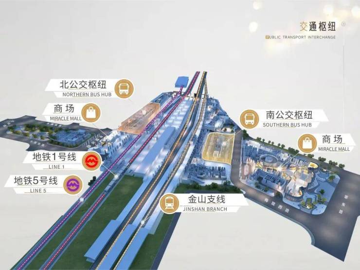 03. 南北公交枢纽:共计20余条公交线通往徐汇、松江、浦东、金山以及闵行其他区域,并设有机场 9 线、莘虹专线,30分钟直达虹桥国际机场、一小时直达浦东国际机场;