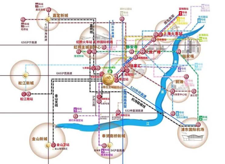 01. 地铁1号线、5号线:20分钟直达徐家汇、30分钟抵达人民广场、陆家嘴、新天地、静安寺等,并可换乘十余条地铁线,通达整个上海;