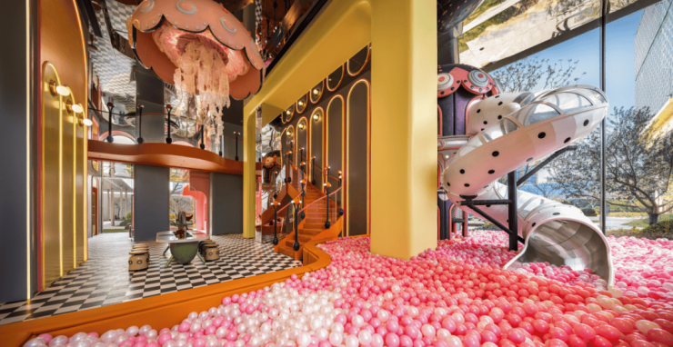 架空层内更设计了一个层高约7.2米的海洋主题儿童乐园,并贴心地为家长们准备了休息卡座。还有一处溯源阿那亚的的临水阶梯书吧,成人与儿童分区,让精神的栖息与孩童的欢笑互不打扰。