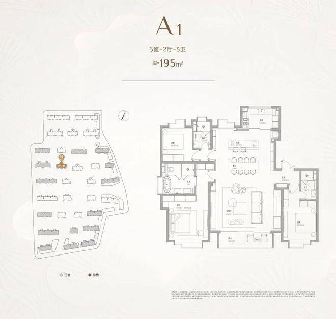 建面约195㎡3房是天安1号首次入市的产品,也是整个项目最高舒适度的产品。它位于社区的中央,楼下就是中央景观轴,视野、采光都相当出众。超大尺度感的客餐厅,东西双厨的设计,更符合当代城市菁英的需求。三套房的设计,每一个卧室都是普通豪宅主卧的尺度感和标准。没有短板的户型,真正的顶奢产品。