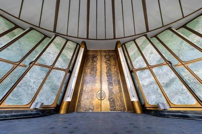 以杭州折扇为灵感而造的超尺度门庭,12片巴西进口百达翡绿玉石屏风,由非遗传承人朱炳仁团队打造的巨幅铜门,“玉镜流光”雕塑,大堂内八根巨幅立柱,还原了扇骨的形态,汝窑冰裂纹的陶片镶嵌,地面拼花运用江南花窗元素……