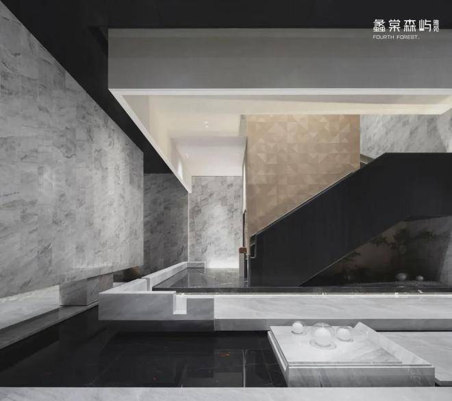 中央立体水庭以层叠水幕为脉,编织垂直绿化的立体绿植矩阵,将森林岛屿的谧境意境融于建筑肌理。多维高差叠景自地面抬升,形成“仰观飞瀑流翠、俯赏溪涧清涟”的沉浸式观景体验,步移景异间,让自然的韵律在空间中层层铺展。