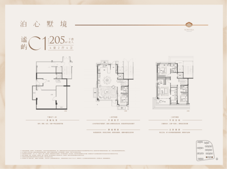 户型特点:下叠边套,南向面宽约9米,客餐厅同宽约5.8米,空间开阔。一楼设南向卧室,采光好且视野佳。二楼为三套房+主卧总统套房设计,主卫南向,可容纳浴缸和双台盆。地下室方正,附赠采光井,利用率高。