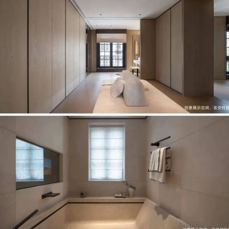 而样板间里这第二个卫浴空间,更接近于享受级。嵌入式浴缸,设计了魔镜系统,可以供业主泡澡时观影娱乐;除此之外,这个卫生间也有独立的淋浴房,并设计有桑拿房。
