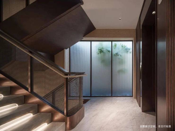 整个泳池天花板,呈现出海派拱形元素,落地玻璃窗外,是下沉式的景观空间: