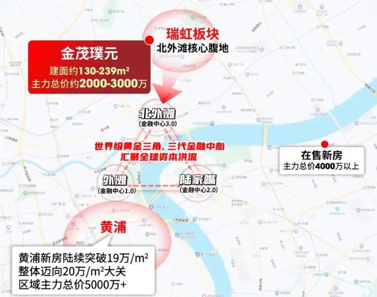 先来看新房市场:我们将视线聚焦到市中心的中心-来看外滩-陆家嘴-北外滩世界级黄金三角周边的新房价格格局: