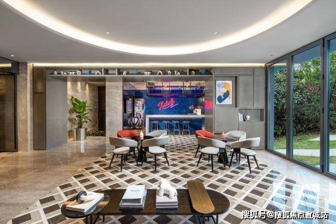 还有吧台、休闲洽谈区、共享会议和健身等功能区,是一个适合交友、会客、休憩、工作、读书、赏景的多功能空间.处处可见的时尚元素,符合当下年轻一代喜好.