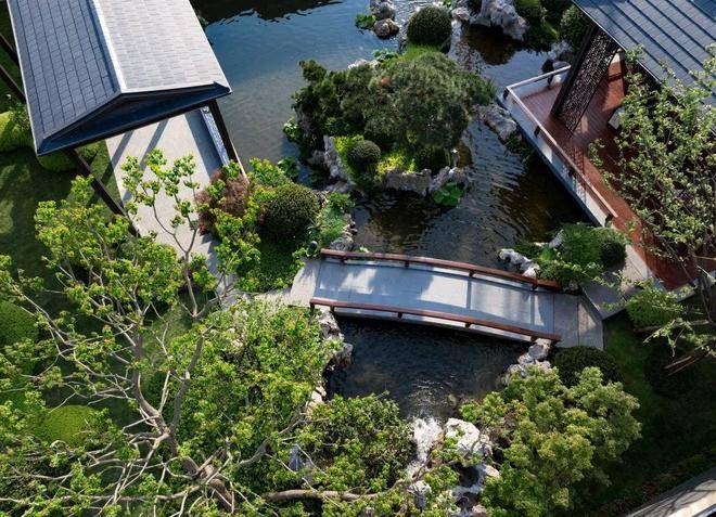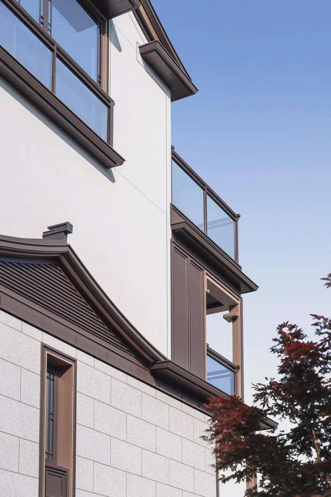 建筑设计出自gad手笔,立面以浅灰石材、咖啡色铝板、涂料为主,主打一个“水墨淡彩”,悬山顶出檐深远、举折平缓。并以简洁金属线条勾勒,将悬鱼、雀替、花窗等元素进行抽象化表达,尽显中式隽永之美。尤其是立面用的铝构工艺,工序繁复,线条立挺,专门邀请古建筑施工单位打造。