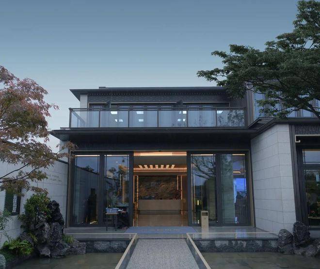 新中式,院墅,中式的坡屋顶与通透的大玻璃立面结合,将东方的传统意境与国际化的审美融合,像极了当前的杭州也像极了此刻的龙坞,既老又新,既传统又现代,既有西子湖的温婉又有钱塘江的磅礴,碰撞出一种全新的审美与生活方式。溪映听庐隆起的屋脊,仿佛群山的绵延,大地与人文交织出全新的风景。