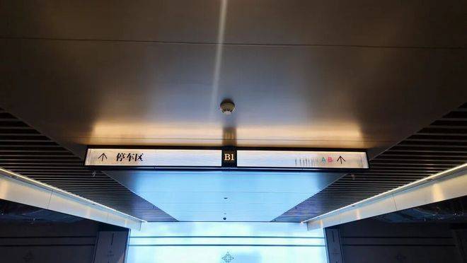 步入地库内部,视线瞬间被彻底打开。顶部采用长达约3米的蜂窝铝板与铝方通格栅铺陈,线性灯带像光流般贯穿其中,让整个空间具备了“酒店式下沉大堂”的仪式感。