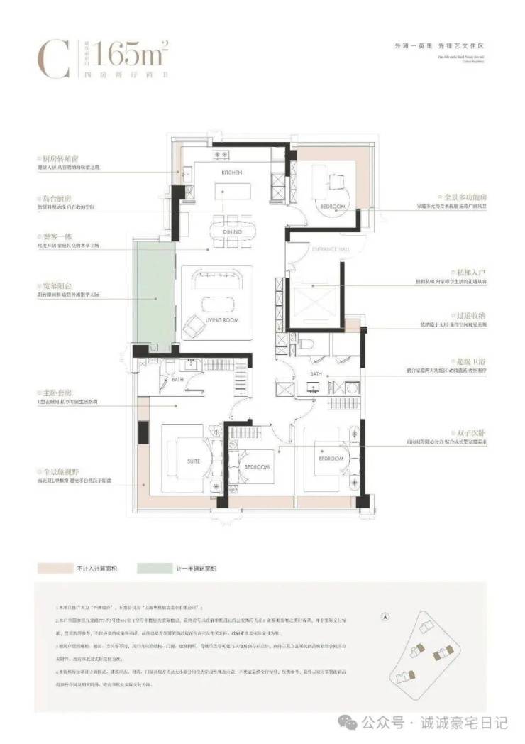 165㎡4房是大横厅改善尺度户型,尊享私梯入户,隐私性满分!三间卧室朝南设计,老人、小孩均可享受南向采光;厨房转角窗、主卧套房、北向书房均配置270度转角飘窗,景观视野相当不错!次卫三分离设计,相当人性化~