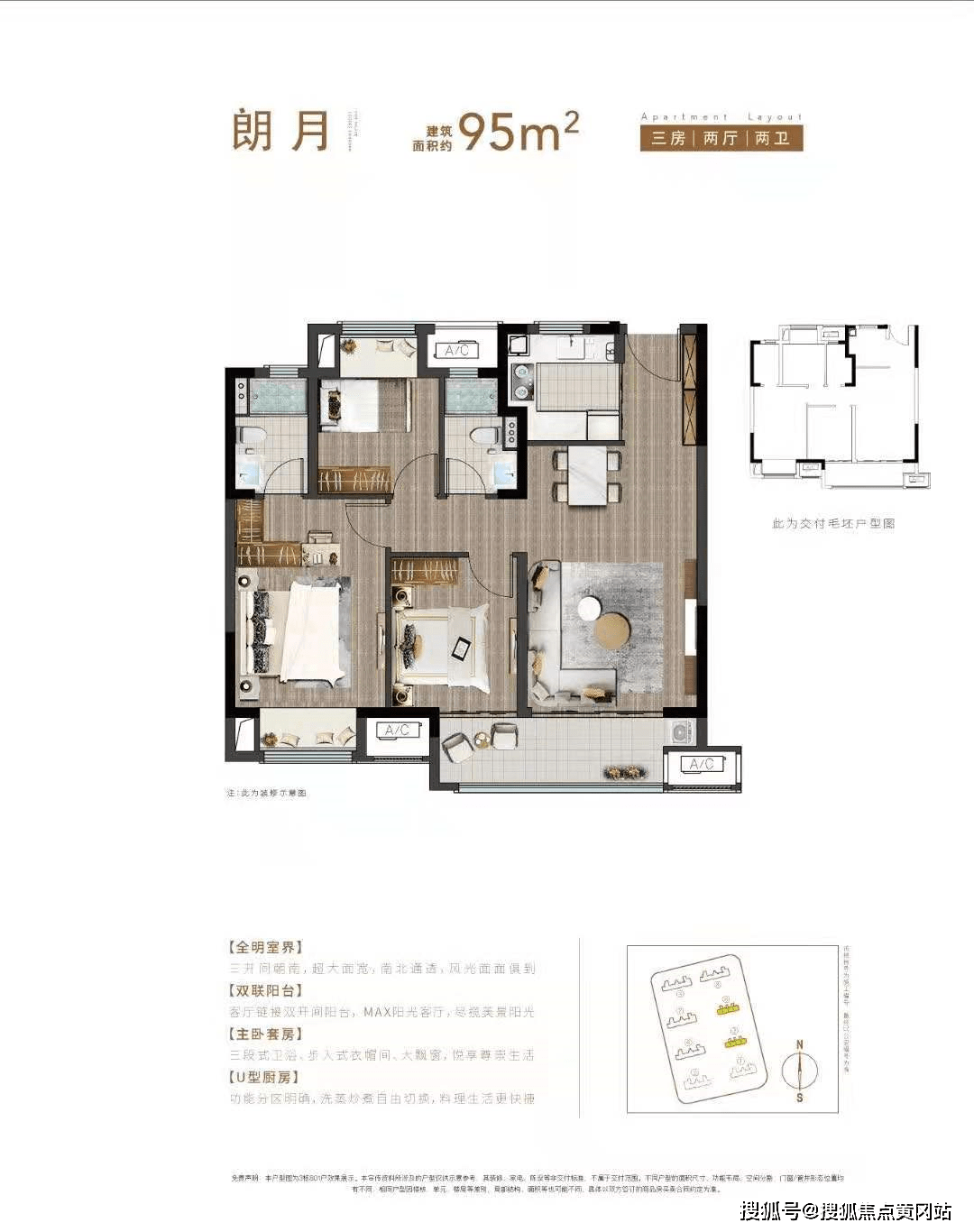 产品涵盖约90-95 m²全能三房户型、南北通透格局,家家连体双阳台。