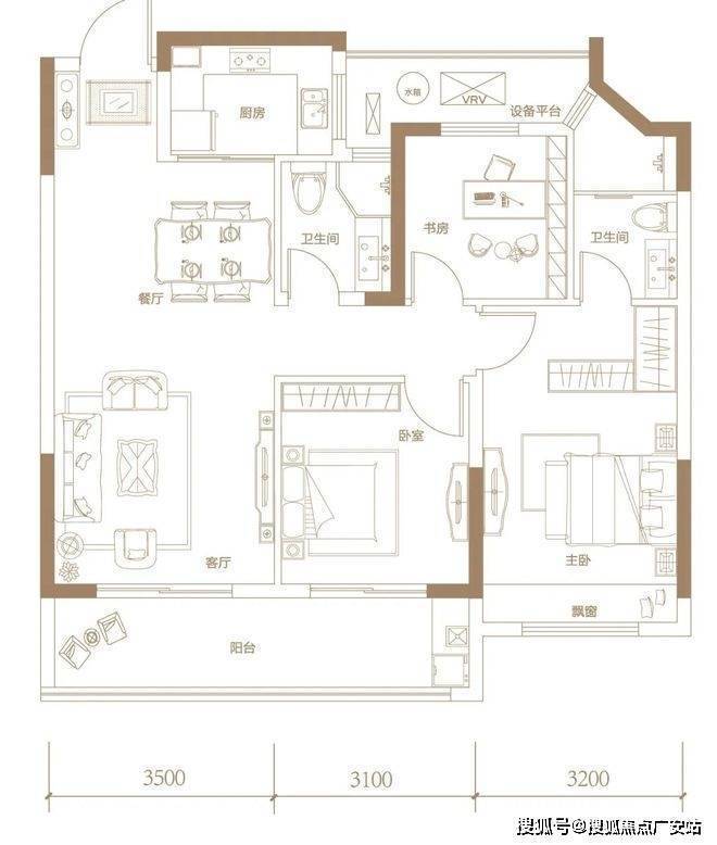 另一个主力三房户型,建面约103㎡,如果要为它的舒适度打分,几乎可以打满分。