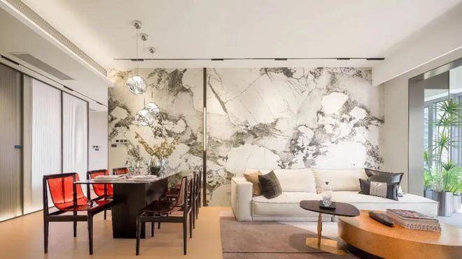 打破客厅、餐厨区物理隔断,以流畅动线串联,消除空间割裂感,让视觉与活动范围双向延伸,小空间显大,大空间更通透。利用地面拼花、顶面暗藏风口的连贯设计,弱化功能区边界,借材质、造型过渡实现“无形扩容”,空间层次更融合。拱门、开放柜体(如大理石餐边柜 )引入相邻空间光线与景致,延伸视觉深度,让客厅借餐厨采光,餐厨借客厅视野,双向放大空间感。客厅收纳、餐厨操作区与社交区结合,减少单一功能对空间的占用,让区域“一专多能”,变相提升空间利用率,达成扩容效果。