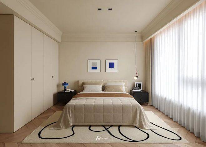 次卧以柔和米调为底色,营造静谧氛围。搭配同色系软包床头,浅棕床搭增添层次感。墙面双幅蓝白挂画点缀,打破单调。单侧悬浮床头柜简约实用,垂吊小灯设计精巧。大面积窗幔引入充足光线,地毯曲线元素柔化空间,整体布局简洁舒适,兼具温馨与雅致,适配休憩、客房等功能 。