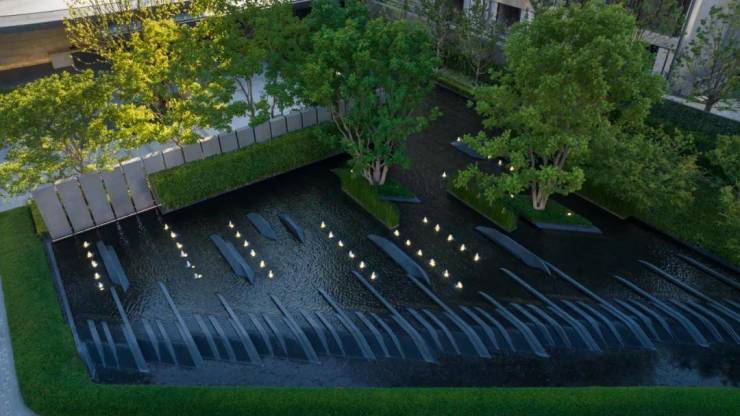 引水入园、以水带路,在低密度的园林中,我们看到的是4000平米的水景,仿佛把这段滨江搬到了社区内。随着不同的场景和光线变化,形成归家动线上的光影变奏。
