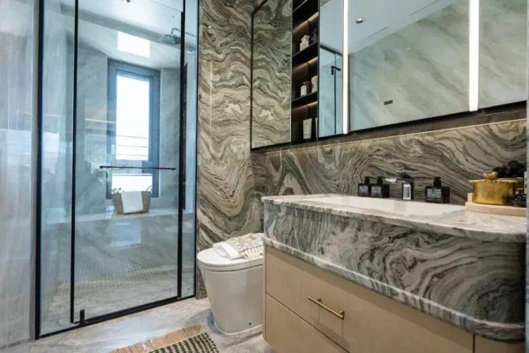 除了原来的标准,还大量选用了鱼肚灰、安第斯雪景、水云沙、雅柏灰...等多种名贵奢石。比如,客厅的电视背景墙、地面、主卫、飘窗等区域选材都升级为奢石。另外,客厅沙发背景墙、卧室背景墙升级为精美皮革,木饰面升级为温润影木,室内的豪宅气质更胜往昔!