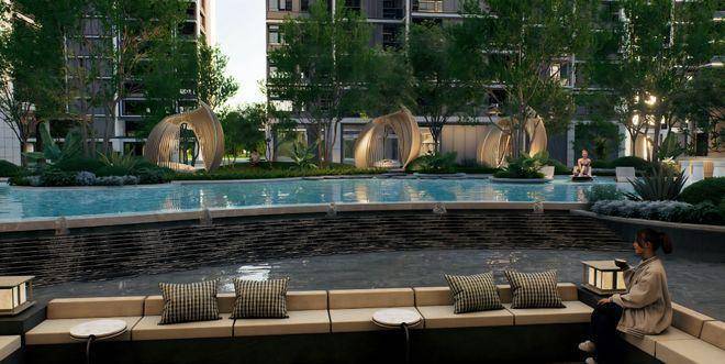 园区景观这块,由蓝颂景观操刀,主打一个“引水入园”。西边离钱塘江约800米,设计上就把水景元素融了进来,搭配立体绿化、小瀑布和休憩平台,整体是偏现代自然的调性。功能上也没含糊,泳池、环形跑道、大草坪、儿童活动区、还有小剧场都配齐了,算是覆盖了遛娃、健身、放松这些高频需求。比较实在的是,绿植选了不少名贵树种,像单棵就值18万的铁冬青,投入上没太省。