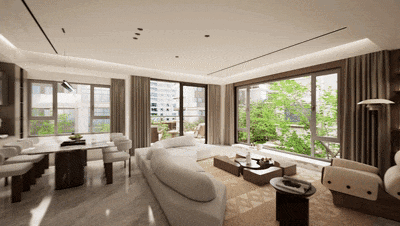 通过上下错层咬合的手法,使得每一个户型都做到“上2下3”或“上3下2”,朝南共5开间的空间布局,合计南向面宽尺度达到约20米,叠墅也完全不输大平层的尺度感。