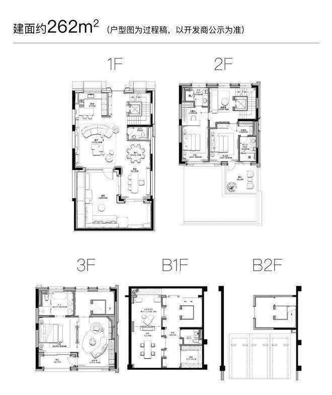 先看约260㎡样板间:地上三层的格局清晰划分出“公共-半私-全私”的动线。