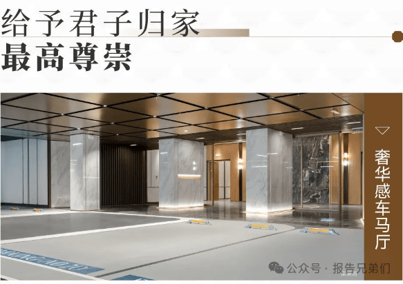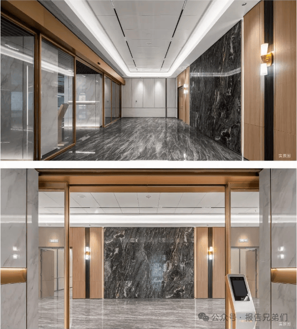 挑高入户大堂也非常吸睛,大面积岩板,两侧动线镶嵌金属线条。