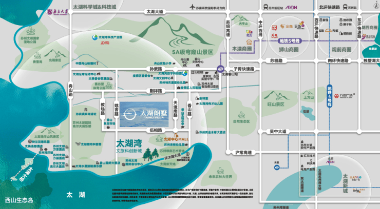 风水格局:项目三面环水,背靠穹窿山5A景区,距离太湖仅约1公里,形成“玉带环腰”的吉利水局,主富贵、聚财福。