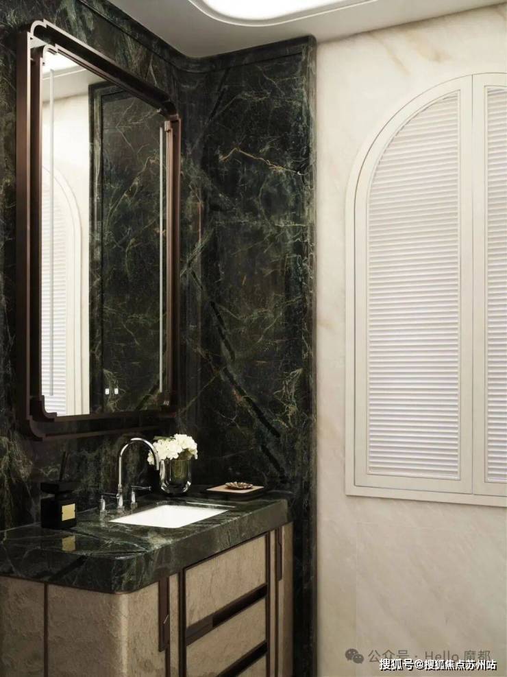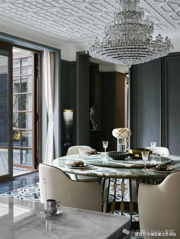 建筑面积约495㎡传家大宅,海派气质内外辉映;深色木饰面与柔和的刺绣主背景,框定空间层次格局,营造稳当厚重的氛围基调,法式留白的墙面与顶部造型,与原筑提取的典型拼花地砖相呼应,经典的精致与典雅,海派传家大宅的气度不言而明。