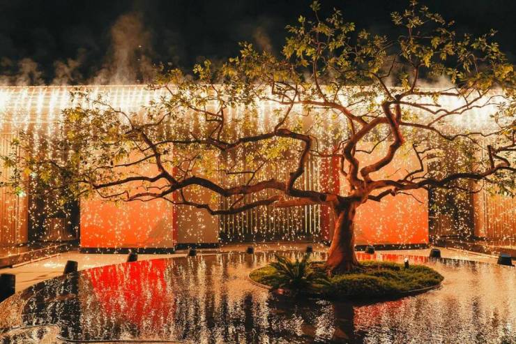 入口阶梯的左右两端的景观灯具,由伊朗奢石“白雪公主”打造,石体历经1.3亿年沉淀,灯光通透,雪色中鎏金细纹交织,如同写意山水画中的留白与流