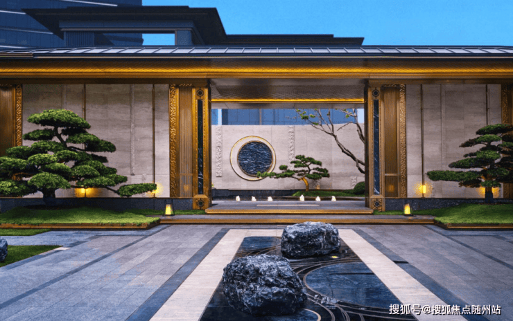 月影江南 灵韵入境:入户两侧水景清泉涌动,婉转迂回,一座精致的宋风美学馆展示在眼前。透过门框衬映出满月景墙,甄选名贵奢石,在虚实掩映间延续着东方诗意山水的写意画卷。