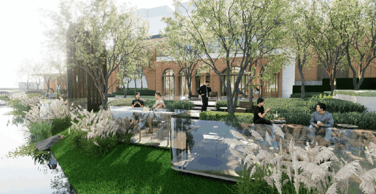 汲取建业里嘉佩乐酒店的红砖美学,将海派建筑经典元素平移,从立面、景观的打造中,实现与风貌产品的理念、品质和文化平权。约1100m²滨水下沉式会客厅,即将于下月正式亮相。