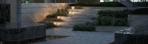 进入之后,是更为丰富的社区生活图景。丰隆海纹中心打造的风雨连廊,贯穿整个社区。它不仅是为业主遮风避雨的通道,更如同一条精致的丝带,将全域景观串联了起来。其单边立柱的设计与沿途叠加的水景、绿植,构成了一道独特的移动风景线。