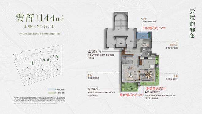 约144㎡上叠,入户独立梯厅,带来更好的功能利用和私密性。