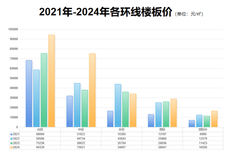 数据显示,2021至2024年间,中环沿线住宅用地的起拍与成交楼板价涨幅已接近翻倍。