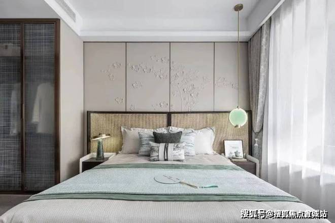 藤编式的大床,还有青色的灯具,都让整个主卧更有一派儒雅之美.