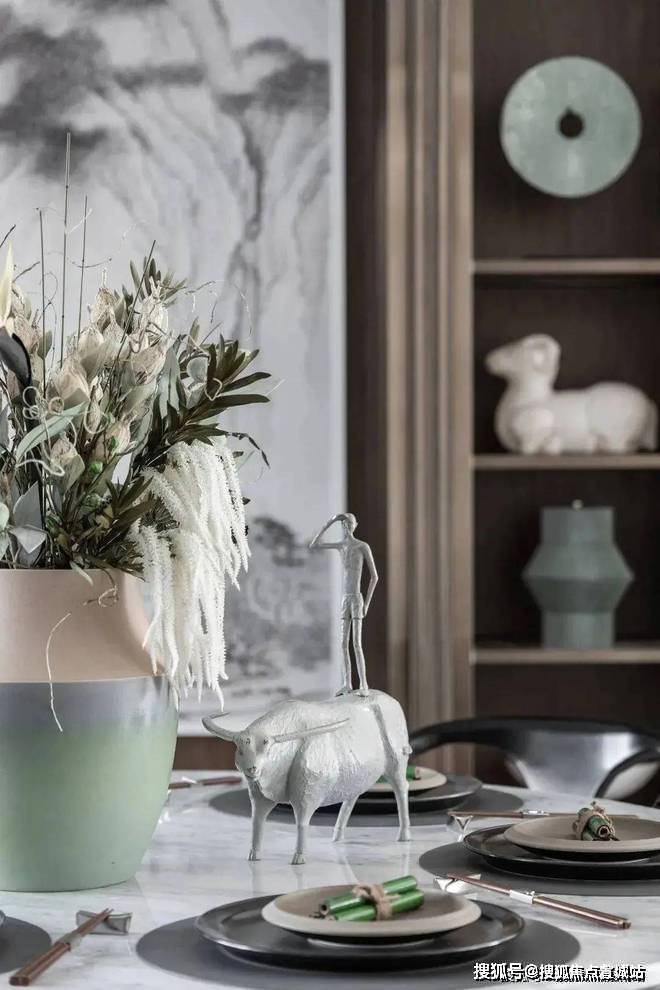 餐厅在整体设计上,沿袭了客厅的配色和风格,简约却又不失格调,尤其是山水墨画元素的融入,让用餐氛围更显温馨感.