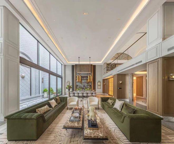 以274㎡的排屋户型为例,一层设置客厅、餐厅、厨房与长辈房,客厅采用“横厅”设计,搭配大面积的落地玻璃窗,将室外园林景观引入室内;