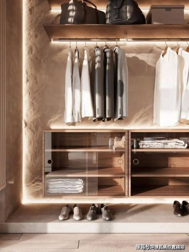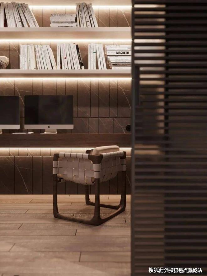 书房的隔间具有相当隐秘性和半开放性,黑色半透双开门很好的隔离了书房、更衣间和主区域,书房的面积不大,却干净、温暖,在辅助灯源的装饰下,营造了更多的居家惬意气息。