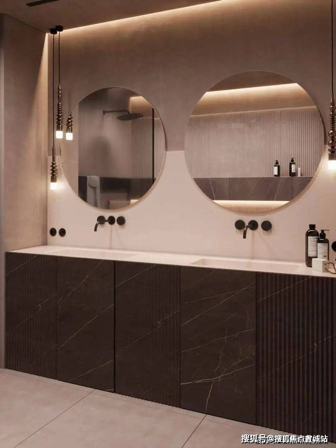 卫生间宽敞而明亮,摈弃过多的射灯或主灯,而是沿用部分照明灯具,立面的装饰线条参差不齐却独有韵味,深色大理石柜体压低了空间的调性,让空间的层次轻重分明。
