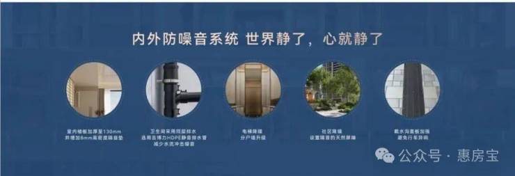 内外防噪音系统:室内楼板加厚至130mm、卫生间采用同层排水并增加8mm高密度隔音垫、电梯降噪分户墙升级、社区降噪设置隔音的天然屏障、截水沟盖板加强避免行车异响...