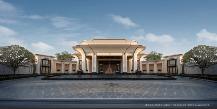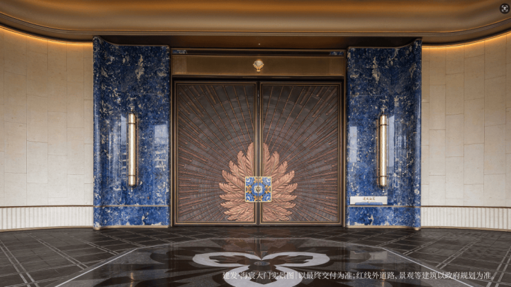 约65米环抱式落客前场,灵感源于“上海豫园-湖心亭九曲桥”,双尊威严铜狮静立、双株名贵金桂环抱一汪“尊华瑞鳞”水景,镇守家宅安宁,寓意流水生财。