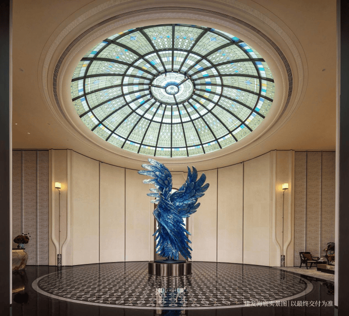彩绘玻璃穹顶漫射柔和天光,艺术拱门与浮雕墙面交替排列,中央紫蓝渐变花艺装置描摹四季流转之美,可上演私享音乐会、业主演说会、亲子读书会、浪漫下午茶等,复现百年和平饭店的顶层社交场景。