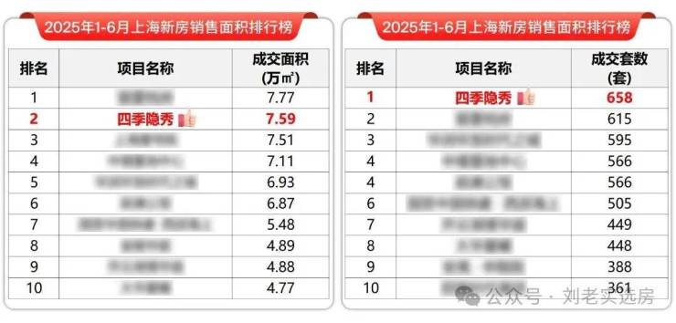 从2025年1-6月上海销售情况来看,四季隐秀成交套数名列第一,成交面积位列第二。