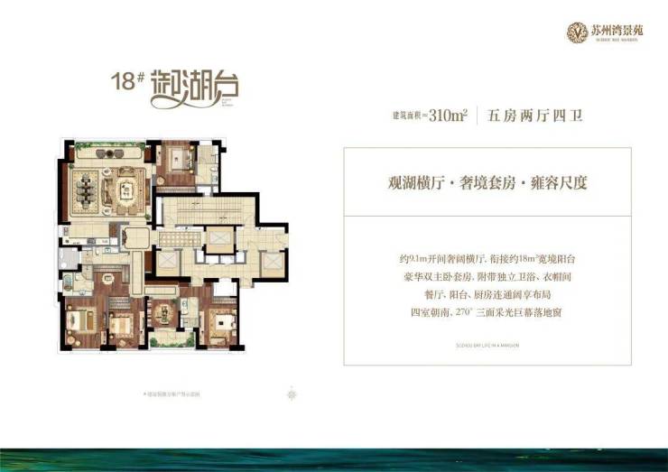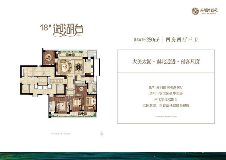 主力户型为约280-390㎡苏州湾绝版湖景平墅,入住人群均为高净值人群,户型由从业40年经验,15次国际大奖国际大师梁志天设计,户内层高3.45米,超大开阔客厅/套房,南北动静分离,洄游客厅+餐厨互动,双阳台最大化观湖大横厅,270度全景落地窗让湖景和城市景观如画卷。