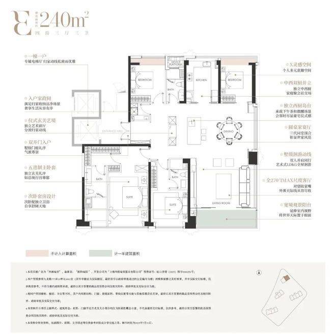 建面约240㎡四房三厅三卫,由国际知名室内设计师吴滨执笔,以厨电、收纳、家政、智能、幕墙、定制“六大满配”,实现了从空间功能、材质美学到身心体验的全维革新: