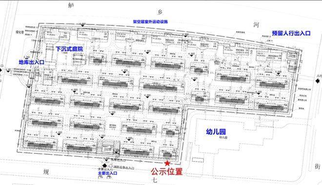 平面图上来看,小区内部西侧设计了一个下沉式庭院,旁边就是物业用房和地块出入口,这里大概也会是未来的售楼处。主出入口在小区南面,北面预留了一个人行出入口。