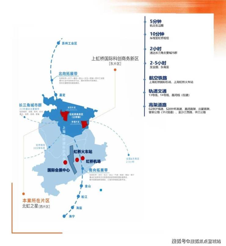 北虹桥作为虹桥国际开放枢纽的创新承载区,兼具“长三角,大虹桥”的双重区位优势,将承载虹桥国际中央商务区主导功能,成为链接辐射长三角的创新经济集聚区、中央商务配套区和高品质国际化社区。“上虹桥·城市更新区”项目围绕“开放北虹桥,创新领航地"总体定位,以承载虹桥商务区主导功能、链接辐射长三角为方向,聚焦打造创新经济集聚区、中央商务配套区和高品质国际化社区,引领赋能虹桥国际开放枢纽北向拓展带发展。(数据来源《上虹桥·城市更新区规划发布》)●交通与基础设施建设: