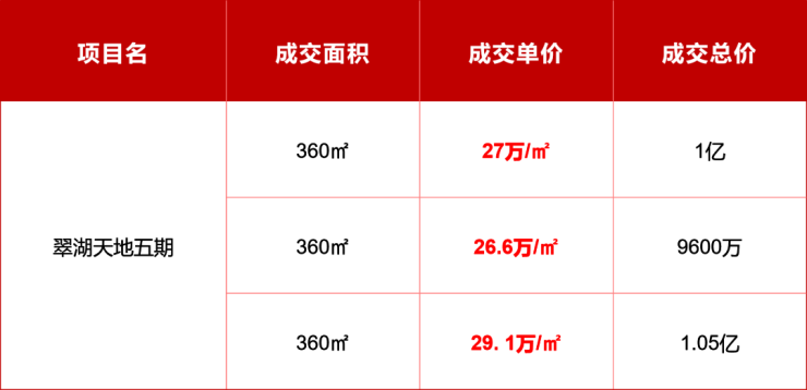 黄浦新天地翠湖五期360㎡大户型过去半年的成交价格,均在26.6万/㎡+,价格最高的一套单价甚至达到29.1万/㎡。