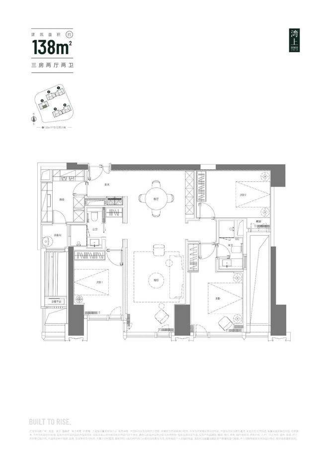 138㎡户型方正,在视觉上显得宽敞大气,功能分区合理,空间利用率高,三开间朝南,确保了室内充足的自然采光。主卧套房设计,全屋配置了充足的收纳空间,并通过设计做到了三个房间与两个卫生间的全明,为居住者提供了更为舒适的生活体验。
